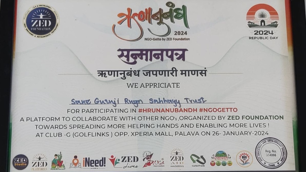 झेड फाउंडेशन तर्फे सानेगुरुजी रुग्ण सहाय्य ट्रस्ट संस्थेचा गौरव करण्यात आला.